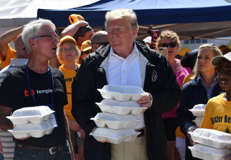 國(guó)總統(tǒng)特朗普親自為民眾發(fā)盒飯,呼吁民眾多使用一次性餐具。