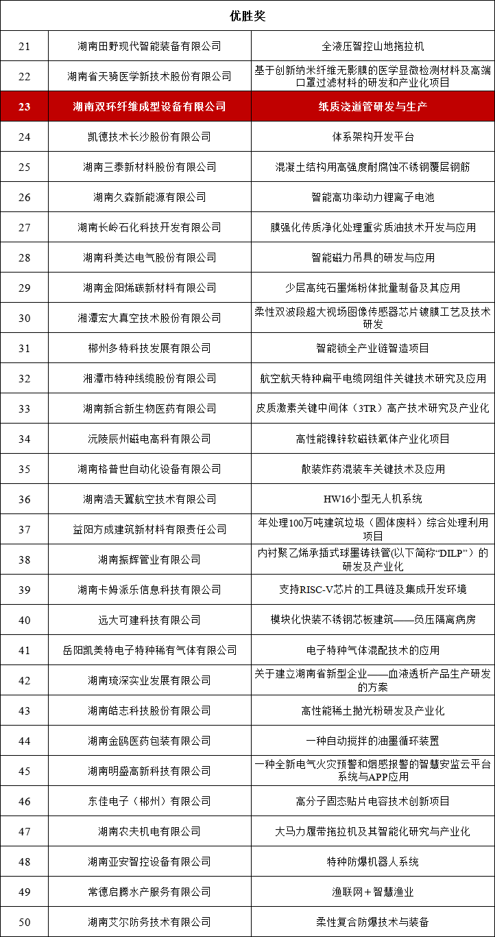 近日,湖南省工信廳公布了2020年“創(chuàng)客中國(guó)”湖南省中小微企業(yè)創(chuàng)新創(chuàng)業(yè)大賽決賽獲獎(jiǎng)項(xiàng)目,湘潭高新區(qū)企業(yè)湖南雙環(huán)纖維成型設(shè)備有限公司的“紙質(zhì)澆道管研發(fā)與生產(chǎn)”項(xiàng)目榮獲企業(yè)組優(yōu)勝獎(jiǎng)。